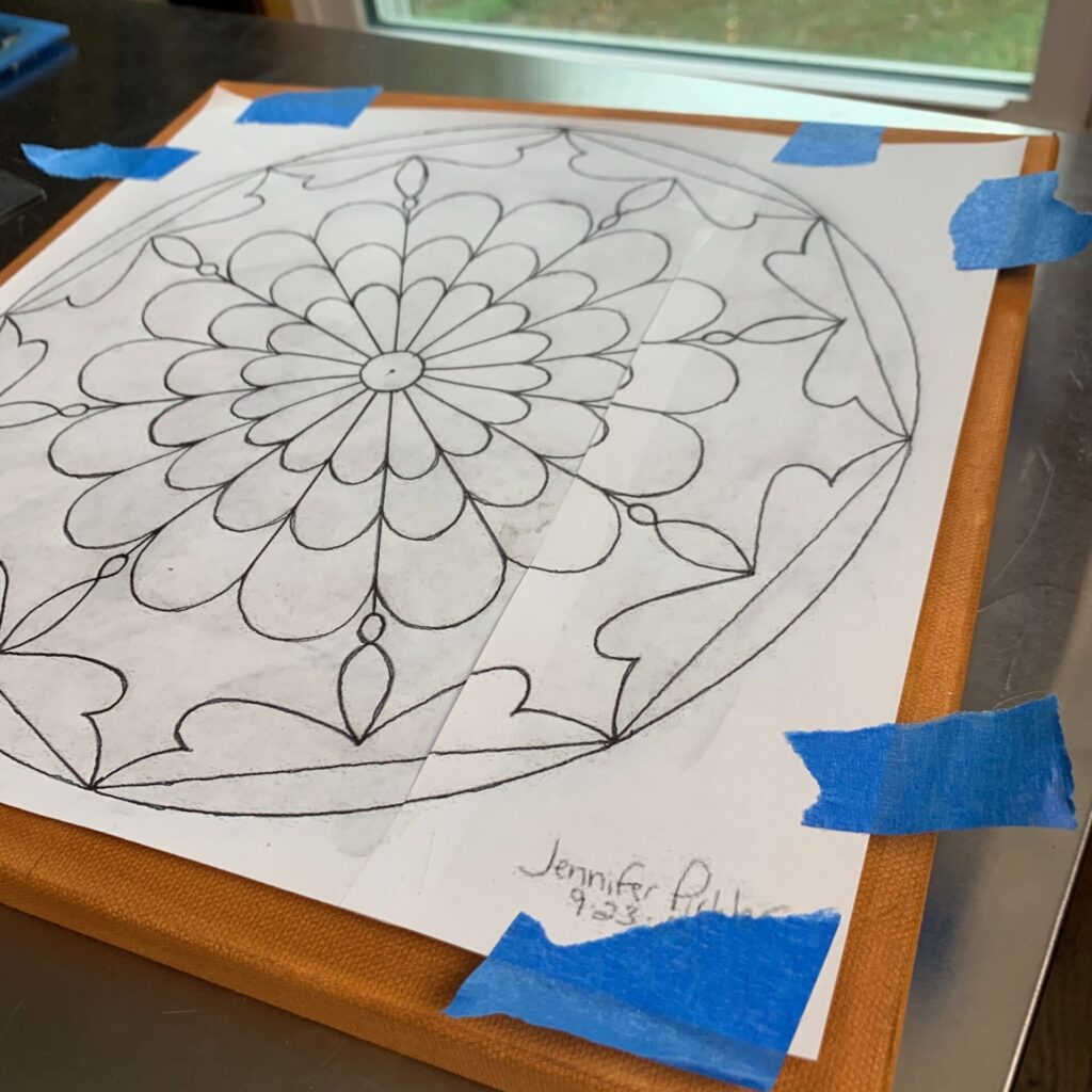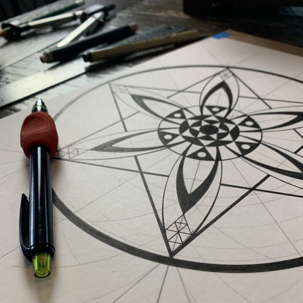 I use a pencil and ruler to find the center of the page, a compass for the circles and a protractor to evenly divide. As I construct the frame work I become inspired and the design begins to reveal itself.